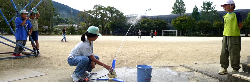 空気は力を加えると体積が小さくできることを学習しました。水ロケットはその縮んだ空気が水を押し出すことで飛びます。子どもたちはペットボトルに水を入れた後、空気入れを押して空気を詰め込み発射させます。少しくらい水がかかるのも楽しんでいました。
