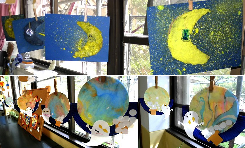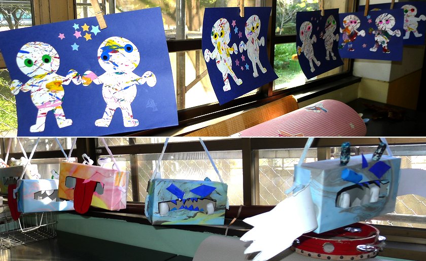 おいもほり (手がたで土と葉っぱを表現し、お芋は丸めた新聞紙をおりがみで包みました)