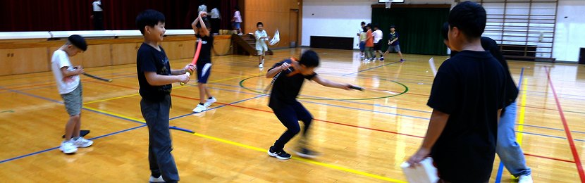3・4年生が劇の舞台練習をするために体育館に集まってきました。刀を振り回しているのは時代劇なのでしょうか。