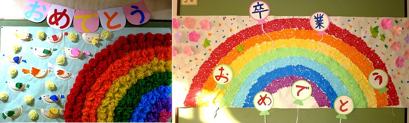 卒業する9年生に、在校生が作った おめでとうのメッセージが校舎のあちこちに飾られています。