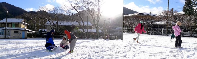 子どもたちが待っていた雪が少しだけ積もりました。運動場では3cmの深さです。小さめの雪だるまや小型のかまくらをつくっていました。